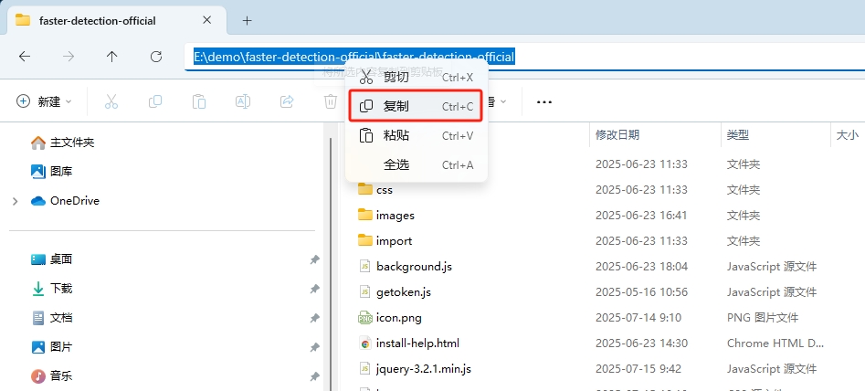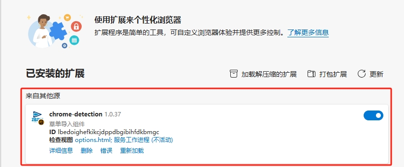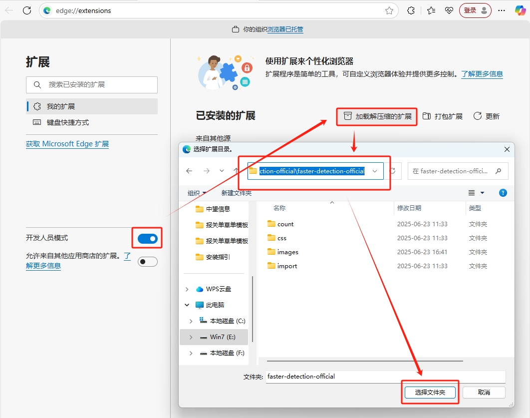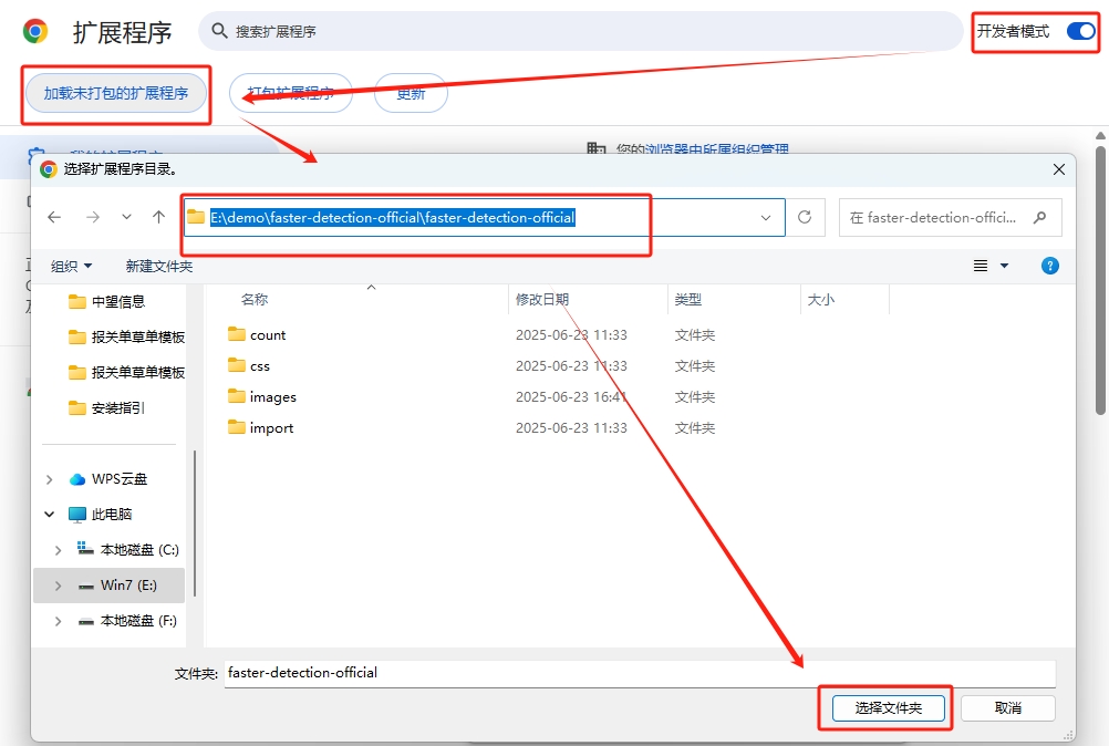 4.打开开发者模式,点击"加载未打包的扩展程序",在目录地址栏里黏贴的'复制文件目录'确认后,点击"选择文件夹",即可完成组件的安装。