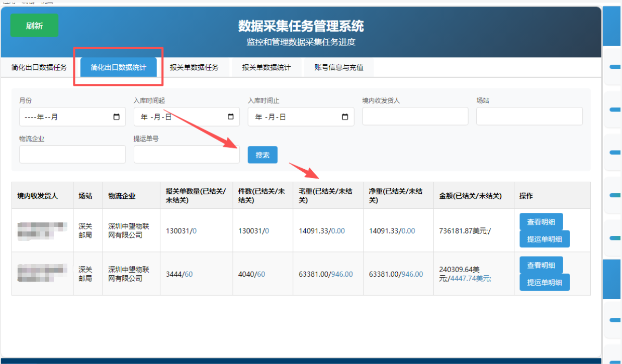 可以在 “简化出口数据统计” 点搜索,即可看到数据。也可以在搜索栏中填写搜索条件,进行精准查询。
