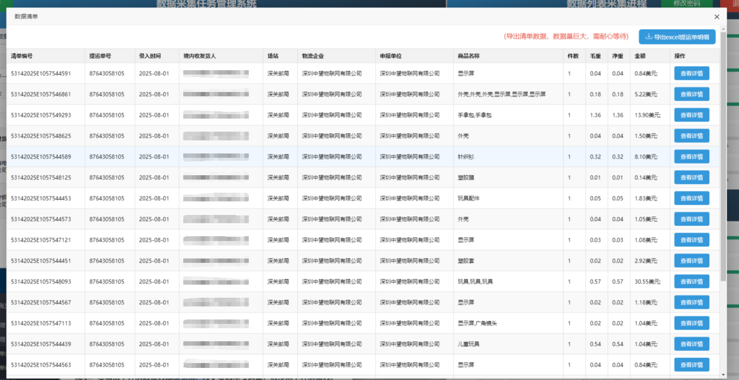 可以点击表格信息中的“查看明细”,即可看到更详细的清单列表。也可以导出清单excel数据。(清单数据量巨大,需耐心等待)