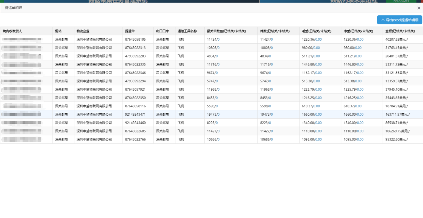 可以点击清单列表信息中的“提运单明细”,查看相关的提运单统计信息 , 并可以导出提运单excel数据。