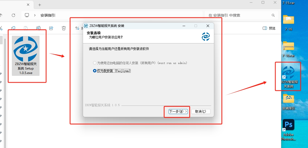 1.点开下载的 "ZBZW智能报关系统 Setup 1.1.2.exe" 文件, 设置好权限和目录,点击下一步,直至 安装完成即可。